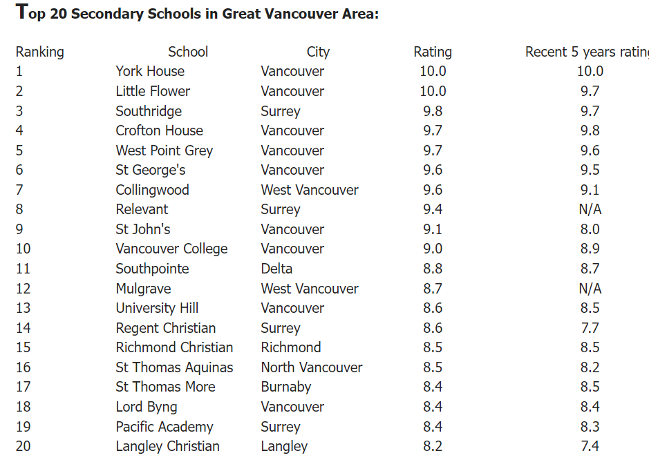 순위표 참고하세요: 초등학교와 마찬가지로 Fraser Institute 순위를 사용하여 밴쿠버 지역의 여러 중학교의 학업 성취도를 판단할 수 있습니다. 그러나 순위로만 판단하지 말고 다른 요소도 고려하십시오.