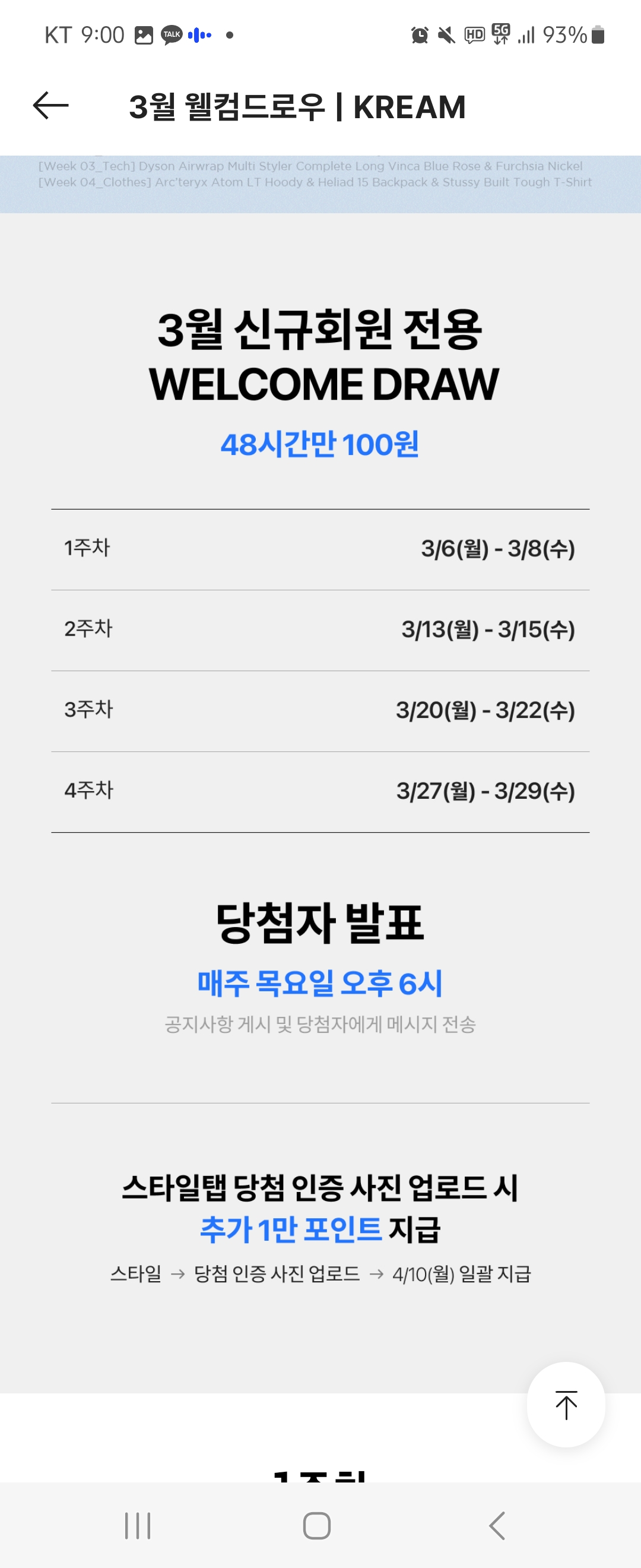 100 당첨 추첨은 마케팅 전략이자 크림의 핵심 기능이라고도 할 수 있습니다. 예전에는 크림 구독자를 대상으로 매주 100건 추첨을 진행했지만 지금은 신규 구독자에게만 한정된 것으로 보인다. 상품의 가치는 보통 50만원 이상이며, 인기 브랜드와 구하기 힘든 아이템을 활용해 추첨을 기획해 진행한다. 유저들은 매주 바뀌는 드로잉 상품 당첨의 기회를 위해 다시 앱에 접속하고 있습니다.