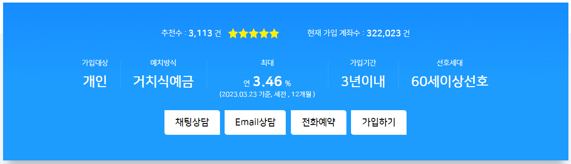 NH농협은행 홈페이지 최신 자료에 따르면 농협 정기예금 금리가 가장 높은 축협중앙회 지점은 경기도 화성에 있는 태안농협의 ‘전자이자우선적금’이다. 연 0.6%p까지 우대금리를 적용하면 4.5%의 세전이율을 얻을 수 있다고 한다. 단, 모든 조건이 충족되어야 하므로 꼼꼼히 확인하셔야겠죠? 또한 대부분의 지점에서 최소 2.7%에서 최대 4.0%의 금리를 제공합니다. 확실히 시중은행보다는 높긴 하지만 그래도 아쉽네요.