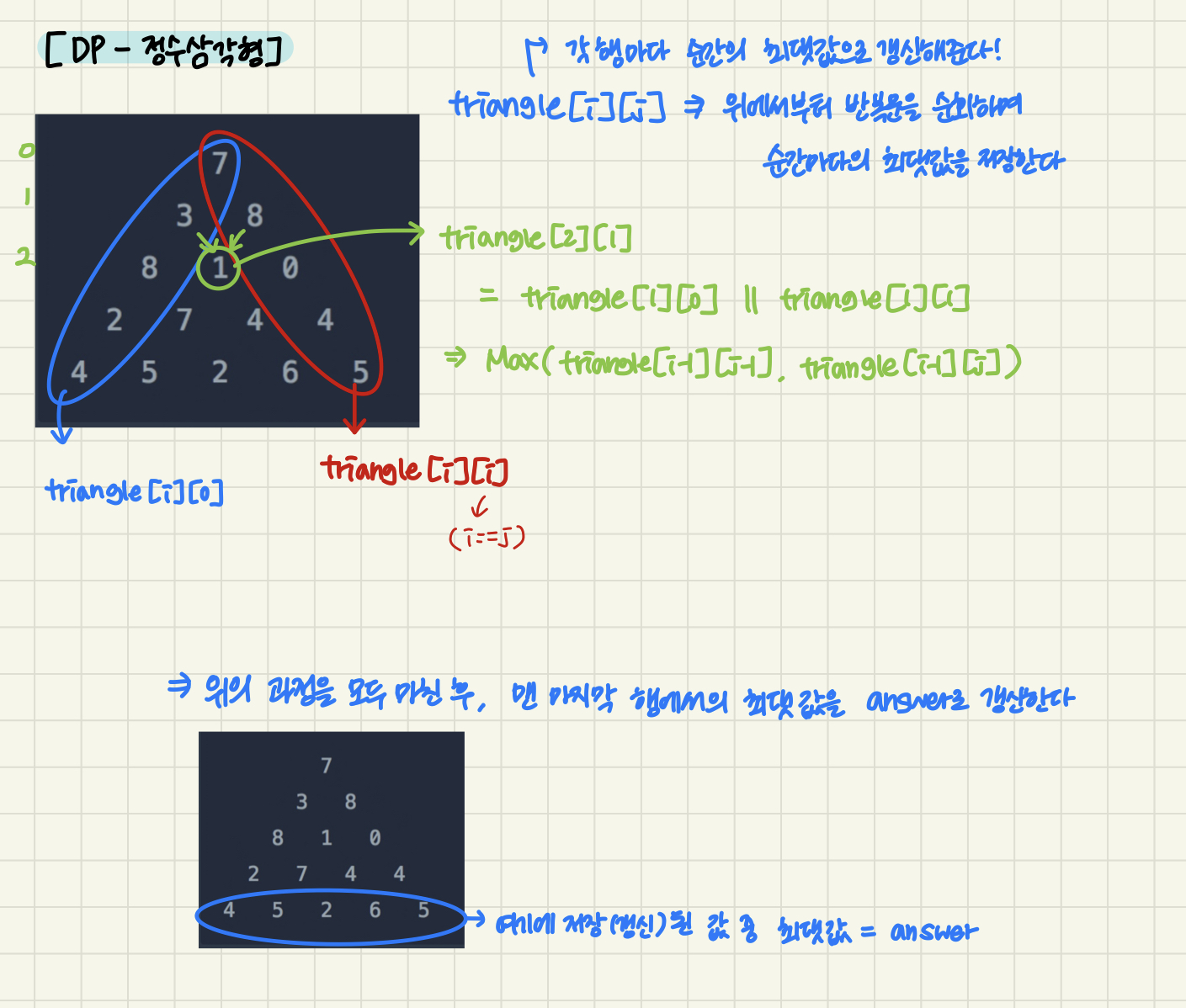위의 과정을 통해 삼각형의 모든 위치에서 최대값을 찾았으니 이제 정답을 찾을 차례입니다.